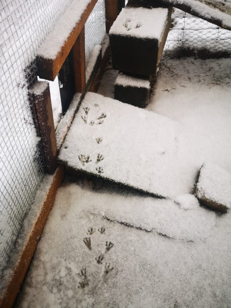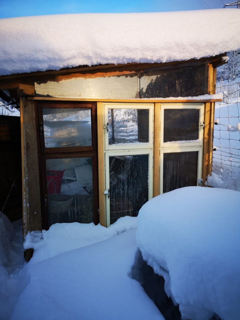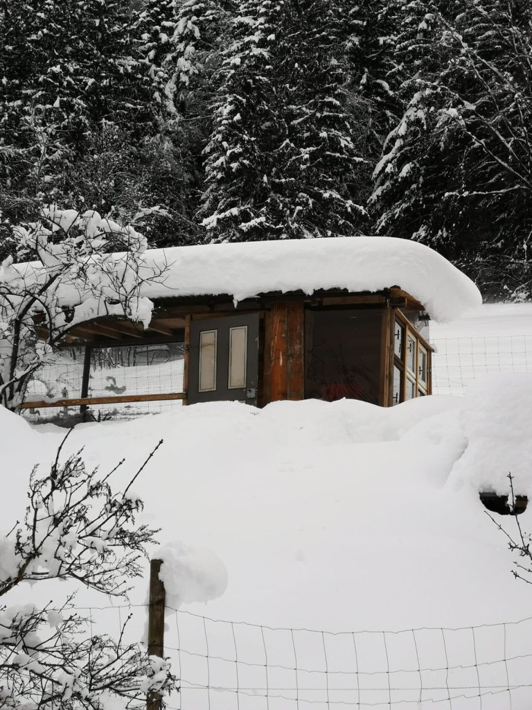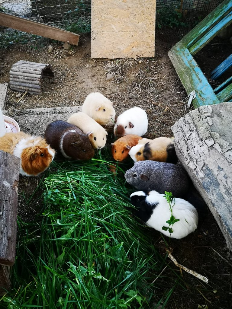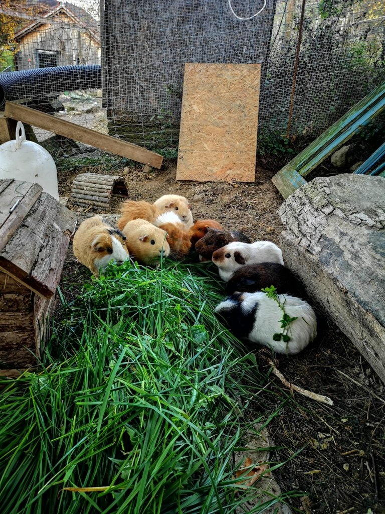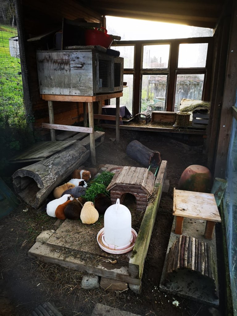 Die Schweinchen leben selbstbestimmt in dieser, vor Fressfeinden und Wettereinflüssen, geschützten Voliere. Sie können sich in die 2 x 1 m isolierte Schutzhütte zurückziehen.