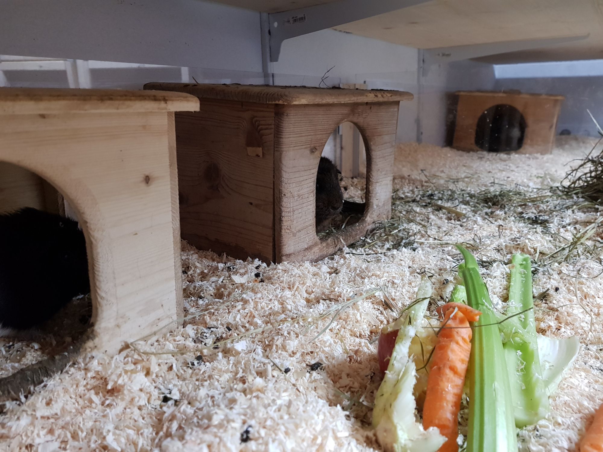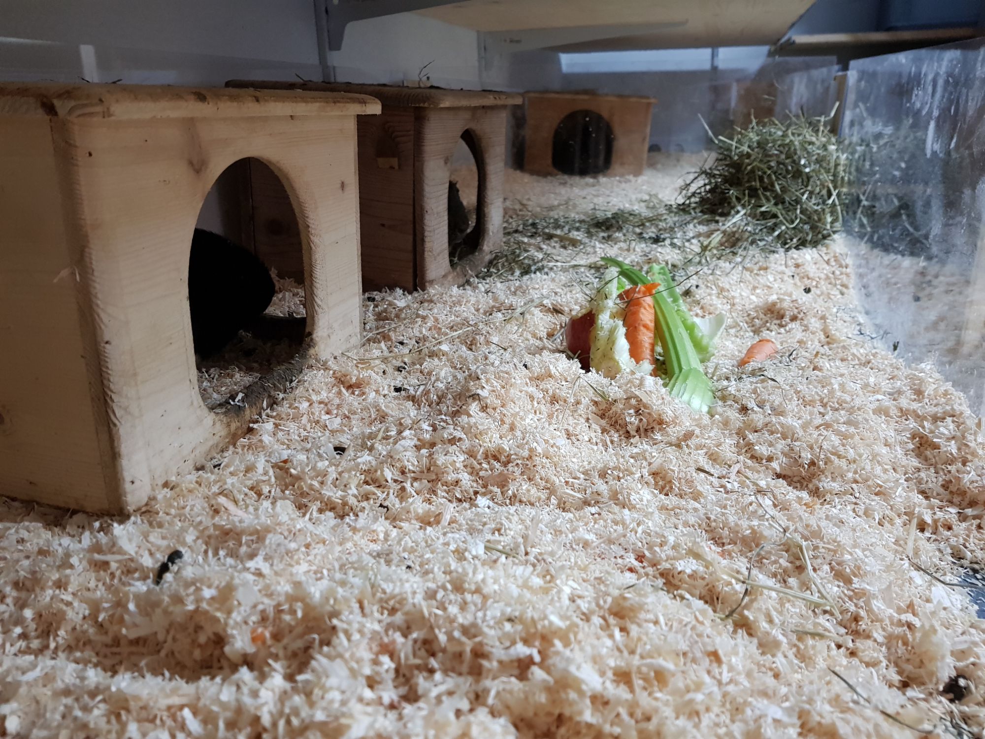Hier gab es schon viele Varianten bei mir und alle waren schlecht. Vermutlich musste unser eigener Leidensdruck bzgl. der Handhabe so hoch werden, dass die Schweine endlich in unseren Schopf einziehen dürfen. Bisher waren sie in Boxen in der Küche. Buchten im Fernsehzimmer, sodass für uns kein Platz mehr war, einem selbst gebauten – im Endeffekt dann doch viel zu kleinem – Stall im Schopf, mit Fleecehaltung – mit der ich garnicht zurecht kam. Und jetzt: So lässt sich in der Kuschelzeit aushalten.